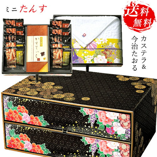 商品紹介 最上級のおもてなし 『匠菴謹製 ミニたんす御進物』は、高級感ただようミニ箪笥に、「今治産たおる」と「和三盆糖入かすてぃら」、「こだわりかりんとう」が入った豪華なギフトセット。