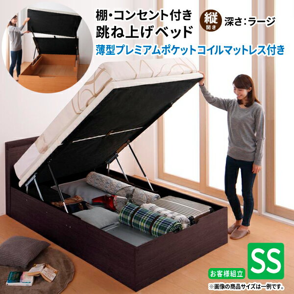 フラットヘッド大容量収納跳ね上げベッド Salomon サロモン 薄型スタンダードポケットコイルマットレス付き 縦開き セミシングル 深さレギュラー 「収納ベッド ラクラク収納 国産シリンダー タテ・ヨコ開閉 2口コンセント」