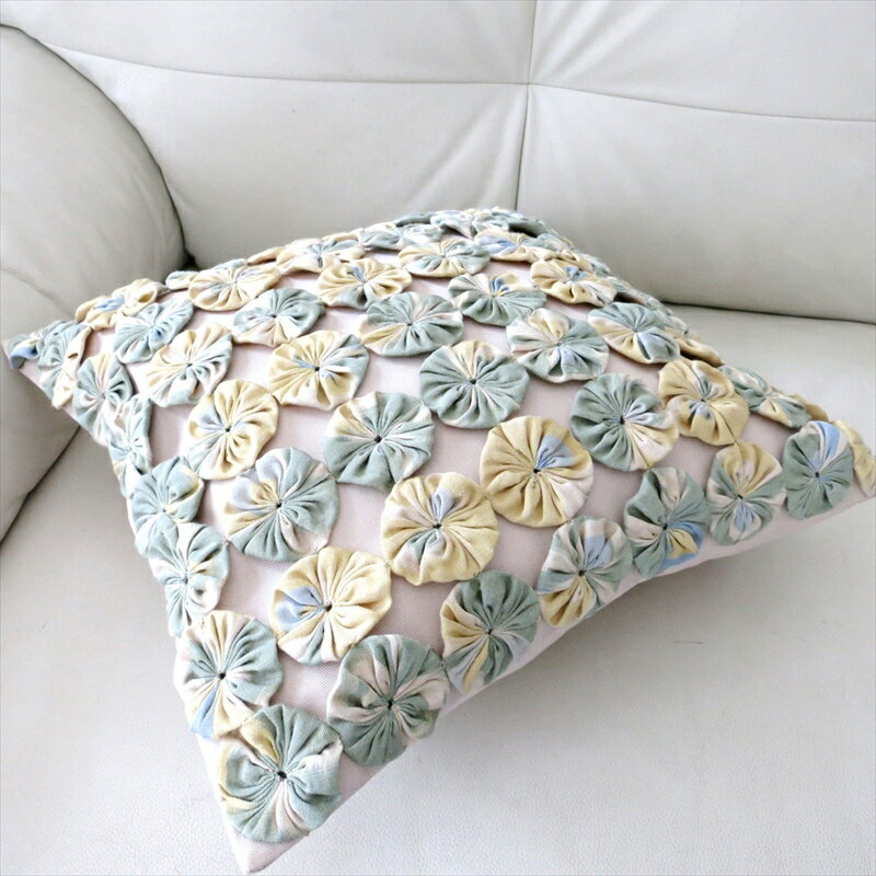 シルクイカット・ヨーヨーパッチワーククッションカバー40×40cmアイボリー/イエロー・グリーン