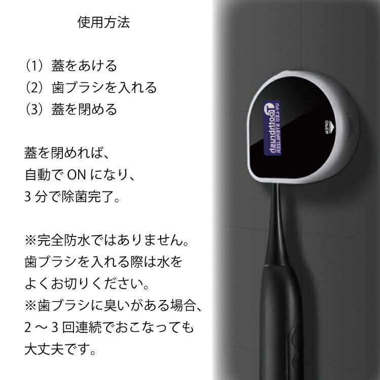 ●99.9%の除菌力のある紫外線UV-C LEDでブラシを除菌 ●コンパクトなキャップタイプの除菌器で日常使用からお出かけまで対応 ●歯ブラシ全体を覆う歯ブラシケースではなく、あえてブラシ部のみを収納するブラシキャップタイプを採用 ●日常の洗面台、お風呂場、など使用シーンを想定して背面にはマグネットと滑り止めパットを内蔵して貼り付けて使用する事が可能です ●ご家庭での使用はもちろん、学校、会社など昼食後の歯磨きを想定した使い方も可能です ●使い方もワンプッシュでカバーがオープンするシンプル操作になります