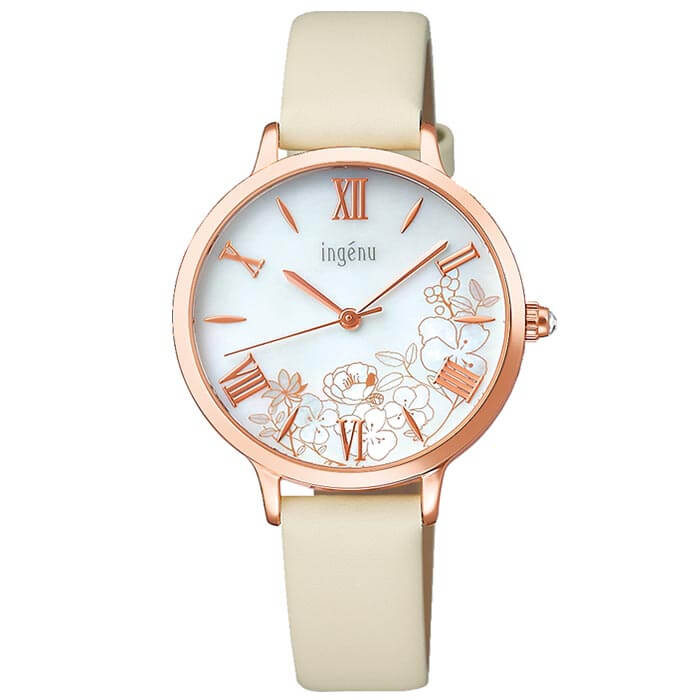 お手頃価格ながら8気圧×ステンレスケースで機能・実用性も○型番 AHJK454 ケース材質:胴部SGP(ピンクゴールド色めっき) 裏ぶた部SSサイズ約:縦36×横30mm重さ約:22gベルト幅:12mmベルト材質:牛皮革(カーフ)カラー:クリームムーブメントクォーツ機能風防素材:カーブ無機ガラス留め金:美錠平均月差±20秒白蝶貝ダイヤルスワロフスキー®・クリスタル入りりゅうず防水機能防水性:日常生活用強化防水(5気圧)付属品ingenu特製ギフトBOX保証書取扱説明書※説明書・保証書に関して入荷時期により仕様、内容が一部異なる場合がございます。