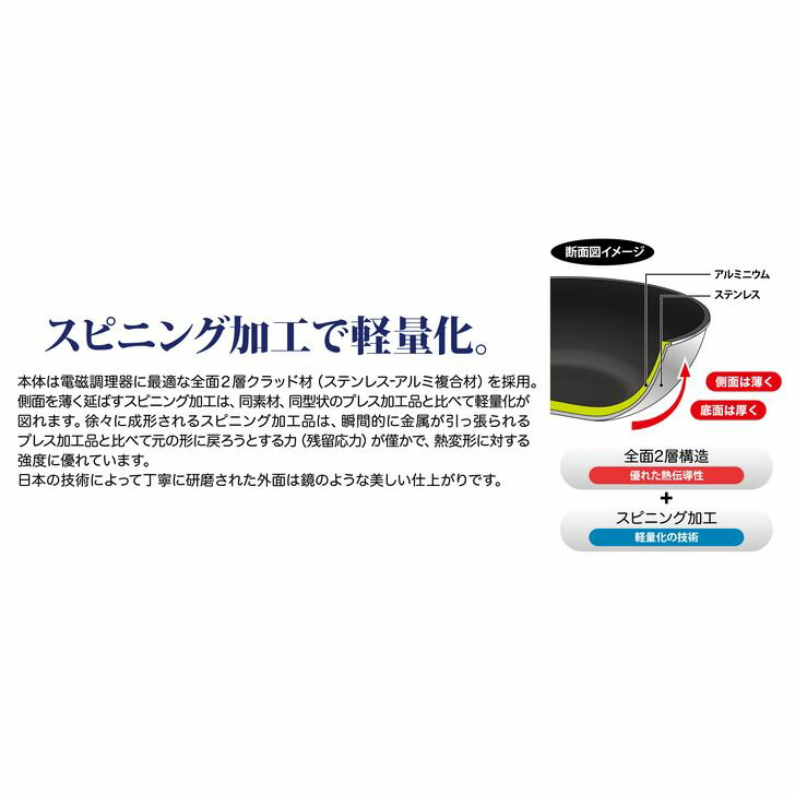 ■商品サイズ:幅47.9×奥行き27.6×高さ9.7cm ■重量:860g ■パッケージサイズ:幅47×奥行28×高さ8cm ■素材・材料:本体:2層クラッド材(内側:アルミ二ウム合金、外側:ステンレス鋼 底厚2.6mm) ハンドル:フェノール樹脂 フック部分:66ナイロン ■生産国:日本 ●本体は外側:ステンレス、内側:アルミ二ウムの全面2層構造。