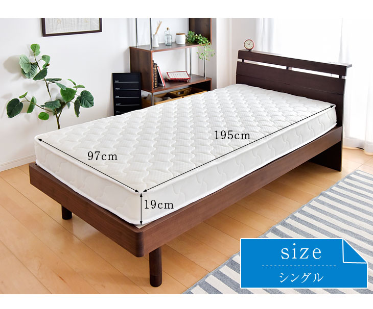 ▼ サイズ違いはこちら ▼ セミダブル ダブル 仕様 サイズ幅97x奥行195x厚み19cm(シングルサイズ)コイル数:465個巻き数:6.5巻線径:2.0/2.2mm線材規格:SWRH72B C種※マットレスは柔らかい素材で作られてますので、圧縮状態からすぐに 復元した状態、また測り方によっては、多少サイズに誤差が生じる場合がございます。