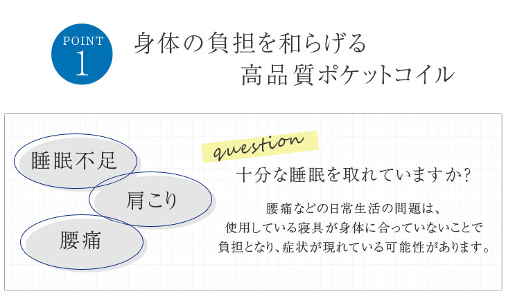 ポケットコイルは体圧のかかる部分だけが凹む独立構造であるため、背骨のS字を保った理想の寝姿勢でお休み頂けます。