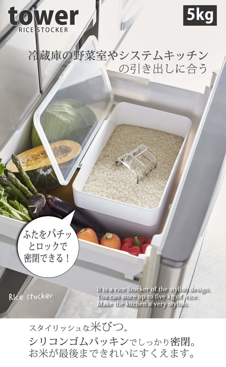 密閉 シンク下米びつ 5kg 計量カップ付 タワー (tower) / YAMAZAKI 山崎実業 仕様 サイズ:約幅30cm×奥行19.7cm×高さ19.2cm 重量:本体:約880g/計量カップ:約50g 材質:本体:ポリプロピレン/蓋:ABS樹脂/パッキン:シリコン/計量カップ:アクリル樹脂 デザイン:日本原産国:中国 RICE STOCKER It is a rice Stocker of the stylish design. You can store up to five kg of rice. Make the kitchen a very stylish. ※WEB上のため、実物と画像とで色など、多少違う点がございますのでご理解ください。