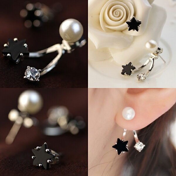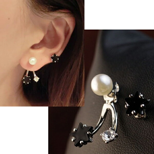 パールピアスに星とビジューをセットしたバックキャッチピアスとブラックの星のピアスをセットにしたおしゃれなピアスセット。