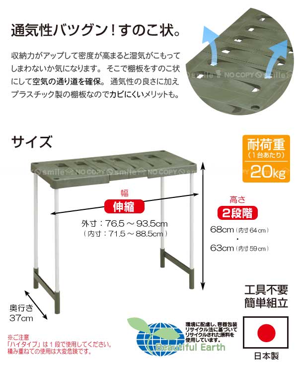 入数 1台入り サイズ (約)幅76.5〜93.5×奥行37×高さ63・68cm 耐荷重 (約)20kg 素材・材質 棚板・補強脚:ポリプロピレン・ポリエチレン パイプ:スチール(PPコーティング) 仕様 組み立て式 原産国 日本 キーワード 押入れ 整理棚 季節家電 ふとん上 デッドスペース 有効活用 押入れ収納 ラック 伸縮ラック 収納棚 すのこ 衣替え クローゼット リサイクル エコ商品 201607-01