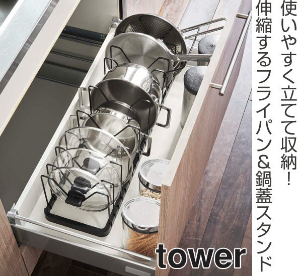 フライパン&鍋蓋スタンド シンク下 伸縮鍋蓋&フライパンスタンド タワー tower ( フライパンスタンド 鍋フタスタンド シンク下収納 鍋蓋立て 伸縮 シンク下収納ラック システムキッチン 引き出し 整理 キッチン収納 山崎実業 )【3980円以上送料無料】