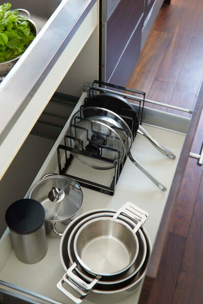 深さの異なるフライパンや高さの違う鍋フタなど、収納するもののサイズに合わせてサイズ調節できます。