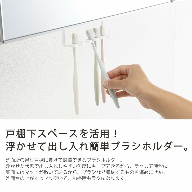 洗面所の吊り戸棚に浮かせて取り付けられる歯ブラシホルダー。