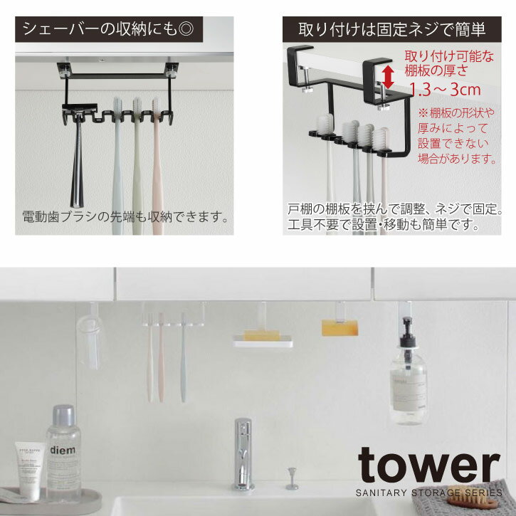 洗面戸棚下歯ブラシホルダー tower タワー/ 戸棚下 歯ブラシ ホルダー ハブラシ スタンド シェーバーラック 吊り下げ 洗面台 吊戸棚 下 吊るす 空中収納 清潔 掃除がラク 時短 おしゃれ YAMAZAKI 山崎実業