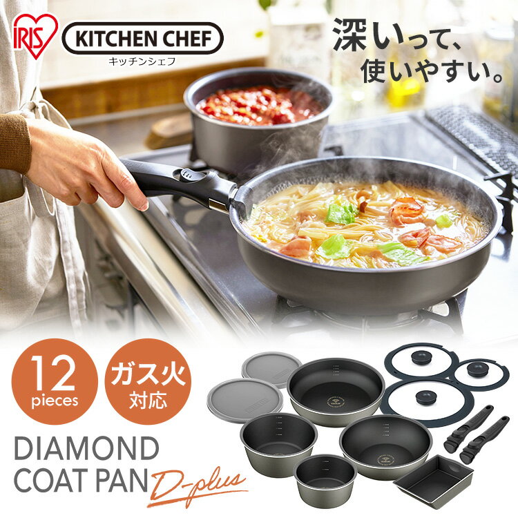 【250円OFFクーポン対象】フライパン 12点セット ガス火用 ダイヤモンドコートパンディープラス DCG-S12S ロイヤルグレー送料無料 ガス火 深型 鍋 なべ セット ダイヤモンドコート ガラス蓋 シール蓋 ハンドル 新生活 キッチン アイリスオーヤマ