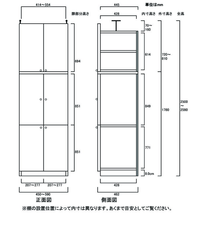 【オプション加工】1.5cm棚板ピッチ、幅木よけ、(配線用)裏板穴加工、タフ棚板穴加工 等 ※幅違い・高さ違い・奥行違いは全サイズ別一覧よりお選び下さい 全面扉付き書庫 タフ棚板(厚さ2.5cm) 奥行40cm×高さ250〜259cm×幅45〜59cm サイズオーダー リビング壁面収納 幅は1cm単位で指定 全面扉付き書庫 本体高さ178cm 突張棚高さ65cm 本体扉高さ170.2cm(全面扉) 突張棚扉高さ69.4cm(全面扉) ご注意 オプション加工を選択されても価格が自動計算されません。