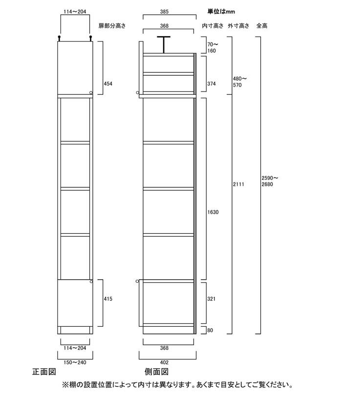 【オプション加工】1.5cm棚板ピッチ、幅木よけ、(配線用)裏板穴加工、タフ棚板穴加工 等 ※幅違い・高さ違い・奥行違いは全サイズ別一覧よりお選び下さい 扉付壁面すきま収納 タフ棚板(厚さ2.5cm) 奥行40cm×高さ259.1〜268.1cm×幅15〜24cm サイズオーダー リビング壁面収納 幅は1cm単位で指定 扉付壁面すきま収納 本体高さ211.1cm 突張棚高さ41cm 本体扉高さ41.5cm(下扉) 突張棚扉高さ45.4cm ご注意 オプション加工を選択されても価格が自動計算されません。