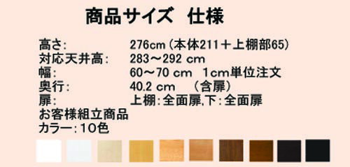 防振大型全面扉付き書庫 サイズ オーダー 全面扉薄型壁面収納_ 全面扉薄型壁面本棚_ 国産壁面整理棚_ 国産壁面ラック_価格 サイズ一覧 色 仕様 多サイズ 耐荷重 棚受 扉 取手 転倒防止 突張棚 天板 突張強化 追加加工 注文 オーダー 大型全面扉付き書庫 (シリーズ天井高208〜292cm、幅15〜90cm) 標準棚板(厚さ1.7cm) 棚板耐荷重:4Kg 奥行40cm 対応天井高さ283〜292cm 幅60〜70cm 低ホルムアルデヒド 全面扉で隠す収納 大型全面扉付き書庫 【幅ピッタリ】 幅60〜70cmを1cm単位でご指定頂けます。