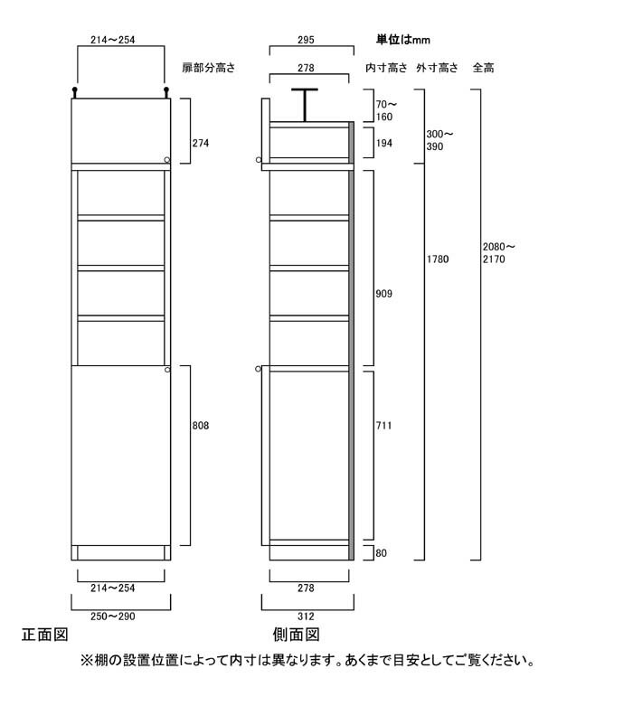 地震対策扉付リビングすきま収納 幅オーダー 商品仕様 ■タイプ: 標準棚板(棚板厚さ1.7cm)タイプ ■棚板耐荷重: 10Kg ■外寸: 奥行31cm×高さ208〜217cm×幅25〜29cm (幅は1cm単位でオーダーできます) ■対応天井高:(2m8cm〜2m17cm) 208cm 209cm 210cm 211cm 212cm 213cm 214cm 215cm 216cm 217cm 伸縮式のつっぱり金具で高さ2m8cm〜2m17cmの天井に対応します (2m8cm 2m9cm 2m10cm 2m11cm 2m12cm 2m13cm 2m14cm 2m15cm 2m16cm 2m17cm) ■外寸(幅): 25cm 26cm 27cm 28cm 29cm ■棚板枚数 移動棚板:4 移動固定棚板:2 ■構成:本体…奥行31cm×高さ178cm×幅25〜29cm 突っ張り棚…奥行31cm×高さ23cm×幅25〜29cm 本体用扉…高さ80.8cm×幅25〜29cm 突っ張り棚用扉…高さ27.4cm×幅25〜29cm オーダー 扉付リビングすきま収納_ 商品詳細 本体 + 突っ張り棚 + 本体用扉 + 突っ張り棚用扉のセットです。