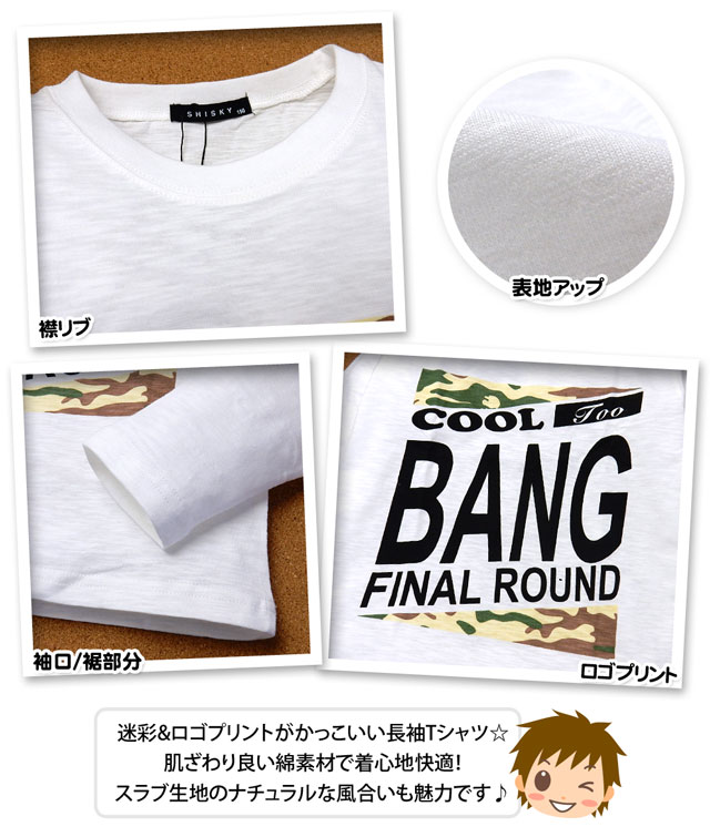 特長・SHISKY(シスキー) ・長袖Tシャツ ・スラブ生地 ・迷彩柄 ・ロゴプリント ・襟リブ ・子供用 ・男の子素材・(本体)綿100% ・(リブ部分)綿95% ポリウレタン5%サイズ/サイズ/着丈/身幅/肩幅/袖丈/ 【140cm】/55/37/33/50cm/ 【150cm】/57/40/36/53cm/ 【160cm】/60/43/38/56cm/ (単位:cm) 商品を実際に採寸した平均値です。