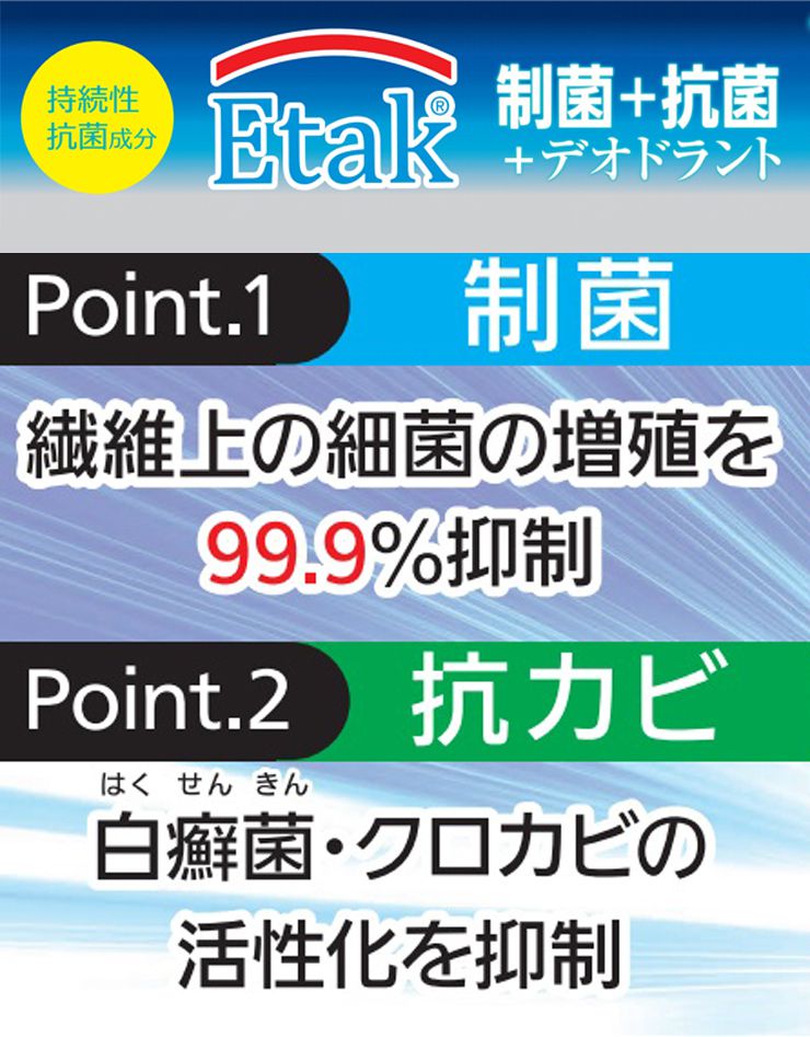 Etak(イータック)との共同開発品!制菌・抗菌・消臭作用が長持ちするEtak加工で驚きの使用感!Etak加工で制菌・抗菌・消臭、繊維状の細菌の増殖を99.9%抑制。