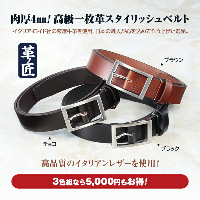 革の匠 日本製 一枚革スタイリッシュベルト(3色組) - カット可 サイズ調整可能 ビジネス カジュアル 兼用 牛革 レザー イタリアンレザー 本革 革 皮 ブラック ブラウン ダークブラウン 黒 茶 メンズ 紳士 ブランド 国産 厚さ 4mm 幅 3cm 高品質 一枚革 ギフト プレゼント