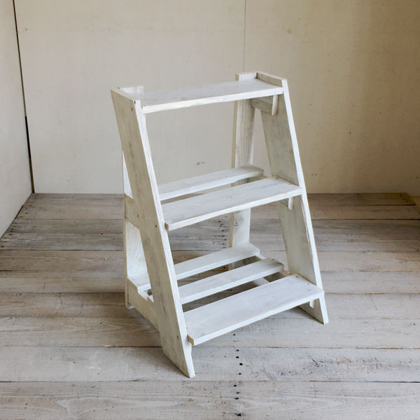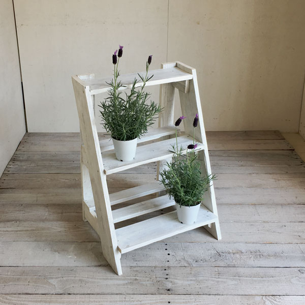 リサイクルウッド フラワースタンド3段ステップ 斜めに傾斜した3段シェルフ お花やグリーンをかわいく飾れます 小物や雑貨の飾り棚としてもおすすめです フラワースタンド3段ステップ 幅48×奥行38×高さ67cm ホワイトにペイントした後研磨し、 色が少し剥がれ落ちたアンティークな風合いに仕上げています 背面はスッキリタイプ 壁にぴったり付けて省スペースでお使いいただけます 棚は通気性のよいスノコになっています ※※※長くお使いいただくために※※※ 水受けの皿をお使いいただくか 水を切っていからご使用いただくこととをお勧めお勧めします >>> カラーは2色<<< 幅48×奥行38×高さ67cm 幅48×奥行38×高さ67cm