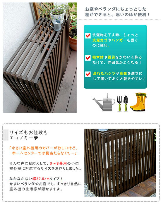 なかなか無い、幅87.5cm小さめサイズのエアコンカバー!モダンでスタイリッシュな縦ストライプのデザインで、室外機の排気効率を損なう事無く、お庭やベランダをおしゃれに変身させます!フラワーラックとして鉢花を飾ったり、ガーデニング用品や洗濯グッズの一時置き場としてもとっても便利! カラーは落ち着いたダークブラウンです。