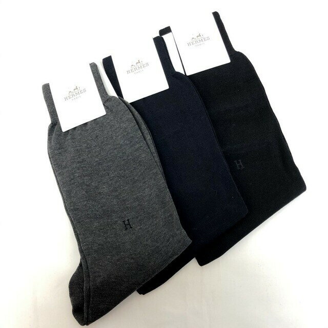 HERMES エルメス ソックス 3枚セット ブラック ネイビー グレー Hロゴ 薄手 080010HA 綿 サイズ10 イタリア製 紳士 ビジネス ギフトセット 靴下 くすした 製品タグ付き 保存箱 美品 未使用品 メンズ T東大阪店 ITMMDM4ZQR98【中古】 RYB8704