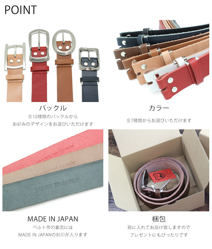 ベルト帯のカラーは全7色、バックルデザインは全10種類! 自由に組み合わせてお好みの1本をお選びください! プレゼントにもおすすめです 全長160cmのXLサイズ仕様(サイズ調整も可能です) カラー BLACK(ブラック) NAVY(ネイビー) BROWN(ブラウン) RED(レッド) D.BROWN(ダークブラウン) TAN(タン) WHITE(ホワイト) ベルト帯素材 革/栃木レザー【クラシコ】 サイズ XLサイズ 幅 約40mm x 160cm ※40mmバックルに適合するようにベルト帯幅の実寸は約38〜39mmとなります バックルデザイン A.Octagon(オクタゴン) B.Oval(オーバル) C.Deformation(デフォメーション) D.Ladder(ラダー) E.Curve(カーブ) F.Tortoise Shell(タートイズシェル) G.Spiral(スパイラル) H.Aerodynamic(エアロダイナミック) I.Narrow Oval(ナローオーバル) J.Cut Corner Square(カットコーナースクエア) バックル素材 合金 サイズ A.Octagon H:約6.0cm W:約5.7cm 重さ:約52.0g B.Oval H:約6.5cm W:約8.2cm 重さ:約55.0g C.Deformation H:約5.4cm W:約7.8cm 重さ:約63.0g D.Ladder H:約5.5cm W:約8.3cm 重さ:約58.0g E.Cueve H:約5.5cm W:約6.8cm 重さ:約57.0g F.Tortoise Shell H:約5.5cm W:約8.0cm 重さ:約67.0g G.Spiral H:約5.4cm W:約6.7cm 重さ:約55.0g H.Aerodynamic H:約5.7cm W:約6.8cm 重さ:約63.0g I.Narrow Oval H:約5.4cm W:約8.7cm 重さ:約57.0g J.Cut Corner Square H:約5.7cm W:約6.8cm 重さ:約54.0g 備考 カラーにつきましてはご覧いただいているディスプレーやスマートフォンの画面により画像と実物の差がある場合がございます。