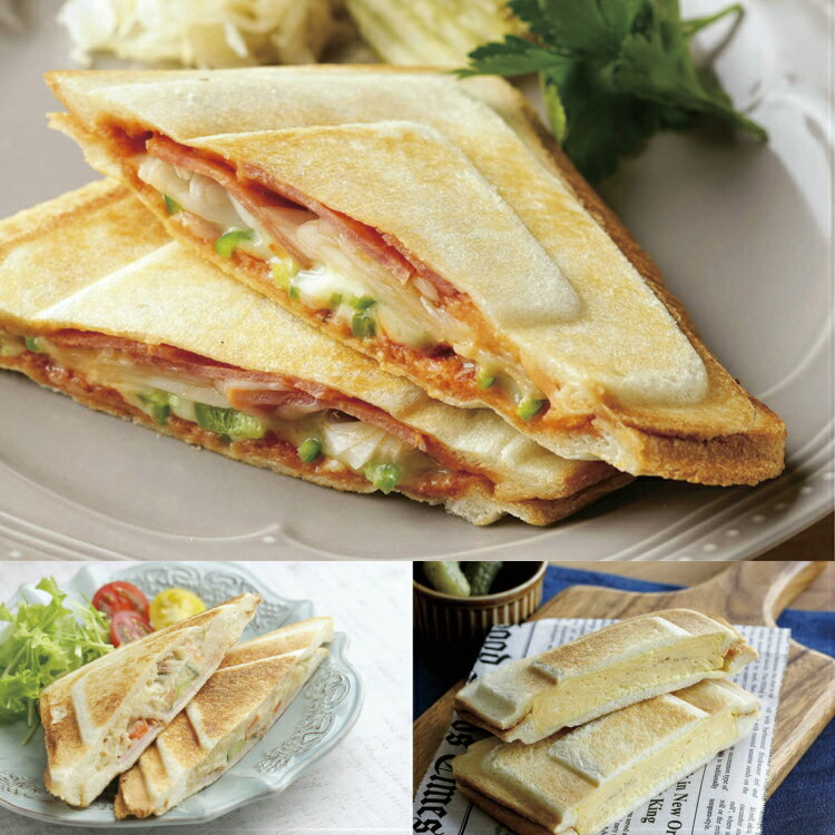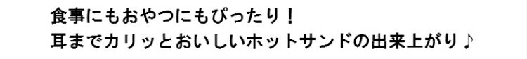 感動食感カリッサクッ!耳付きの食パンをそのままサンド!耳の切り落とし不要!サンドウィッチ用のパンも不要! 耳の部分をカリッと焼き上げ!ピッタリくっつくからこぼれにくくて食べやすい!こだわり圧着設計!だから具材のうまみをしっかり閉じ込める!レシピ付きですが、アレンジしだいでおいしさも、たのしさも無限大! ■サイズ:290×245×100mm ■重量:1,630g ■材質:本体/ポリプロピレン・ステンレス鋼、プレート/アルミ(ふっ素樹脂加工) ■仕様:消費電力/900W、コードの長さ/1.4m