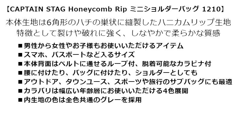 【ベルトポーチ ミニ】【小物入れ ポーチ】【ベルトポーチ メンズ】【カラビナポーチ】【作業ポーチ】【メンズポーチ】商品情報 ■商品名:CAPTAIN STAG Honeycomb Rip ミニショルダーバッグ 1210 ■サイズ: 約タテ14cmxヨコ10cmxマチ5cm ■重 量: 約80g ■素 材: ポリエステル(ハニカムリップ) ■カラー: ブラック/グレー/ネイビー/レッド ■仕 様: ・6角形のハチの巣状に縫製加工のハニカムリップ素材 ・裂けや破れに強く、しなやかで柔らかな質感 ・性別年齢問わず使いやすい仕様 ・スマホ、パスポートなど入るサイズ ・ベルトループ付き ・脱着可能なカラビナ付き ・アウトドア/デイリー/スポーツ/旅行のサブバッグなどにおすすめ ・内生地の色はグレー ・留め具の種類: ファスナー ・ポケットの数:2(外側1/内側1) ・ショルダーストラップ付き(全長130cm) ・ペンホルダー付き ■イメージ他:おしゃれ・お洒落・かっこいい・ナイロン・ミリタリー・カジュアル・シンプル・使いやすい・収納 ブラック ネイビー グレー ご注意 ※記載しておりますサイズ・重量は測定方法により若干異なる場合があります。