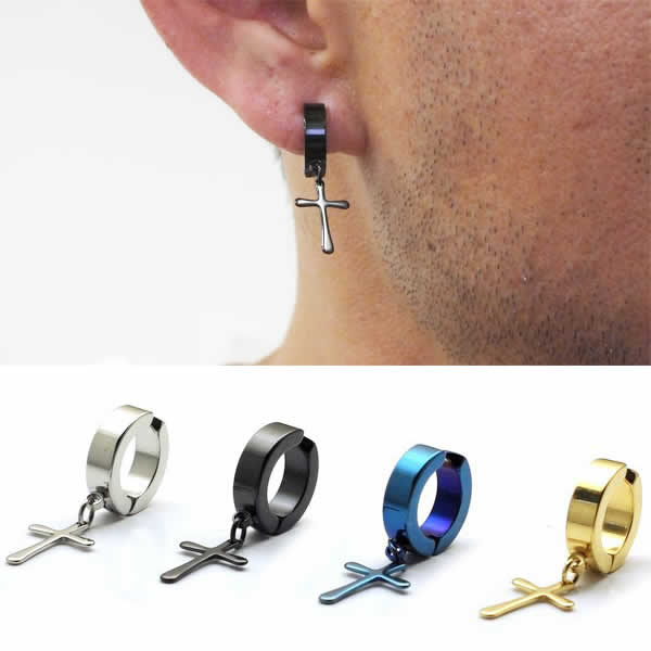 クロスチャーム ステンレスイヤリング 1個販売 十字架 イヤーカフ メンズ レディース サージカルステンレス 揺れる 挟む はさむ フェイクピアス 軟骨 ブラック 黒 ブルー 青 ゴールド 金 シルバー 銀色 フープピアス風 リングピアス風 ノンホールピアス スモール 小さい ミニ