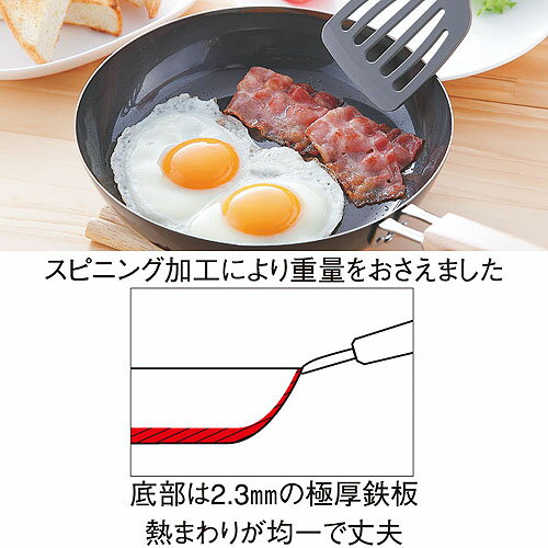 金属加工の街新潟県燕市で製造 鉄のフライパン 調理しながら自然に鉄分補給! ○サイズ:(約)280×425×95mm ○材質:本体/鉄(板厚2.3mm)ハンドル/天然木 ○表面加工:透明シリコン焼付塗装 ○重量:(約)1,384g ○原産国:日本製