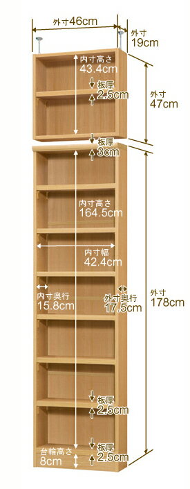 天井つっぱり上置棚サイズ奥行17.5cm×高さ47.0cm×幅46cm材 質本体・プリント紙化粧繊維板突っ張り金具・スチール塗 装ウレタン樹脂塗装本体:オーダーマルチラックサイズ奥行19cm×高さ178cm×幅46cm材 質プリント紙化粧繊維板塗 装ウレタン樹脂塗装棚 板棚 板耐荷重左の耐荷重基準値表を参照棚 板奥行15.8cm奥行19cm×高さ232〜241cm×幅46cm