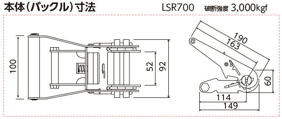 商品の特徴 ●ベルト材質:ポリエステル/ベルト破断強度:4,000kgf ●幅50mm×厚2.5mm ●本体・端末金具/SUS304 ●このタイプのバックル本体、端末金具はステンレス製です。