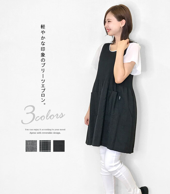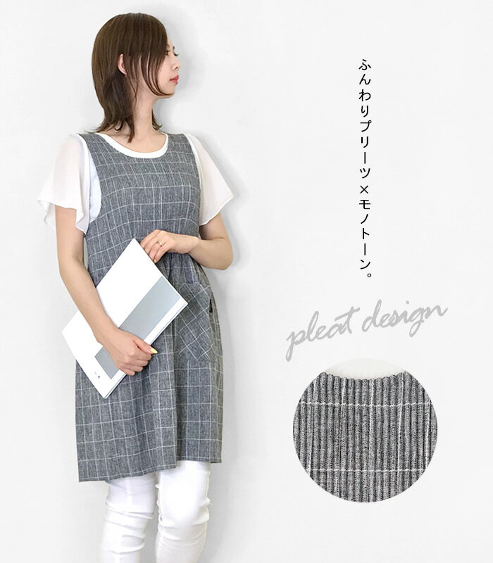 ・サイズ(平置き採寸) 着丈:約84cm 身幅:約44cm ・素材 ポリエステル 100% エプロン,胸当て,レディース,可愛い,かわいい,おしゃれ,チュニック,プルオーバー,ワンピース,黒,ブラック,チェック,人気,母の日,ギフト,プレゼント楽ちんなのに大人っぽく着れるプリーツエプロン♪