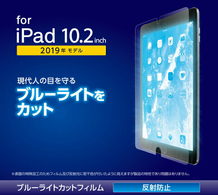 液晶ディスプレイが発する光の中の青い部分「ブルーライト」を大幅にカットするiPad 10.2インチ 2019年モデル用の反射防止タイプの液晶保護フィルムです。
