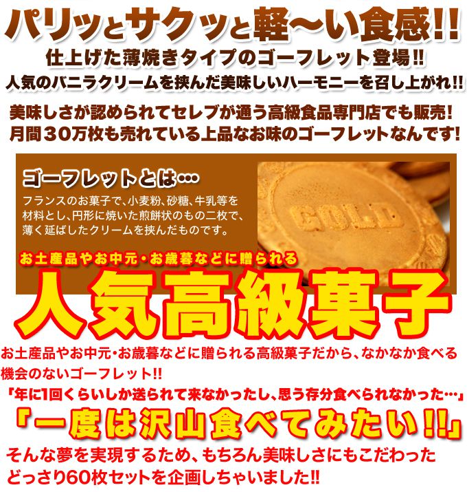 ■商品名: ゴーフレットどっさり60枚■名称:バニラゴーフレット■原材料名: 小麦粉、砂糖、鶏卵、牛乳、植物油脂、粉糖、食用精製加工油脂、脱脂粉乳、食塩、ココナッツペースト、洋酒、膨張剤、着色料(カラメル、カロチン)、 乳化剤、香料(原材料の一部に大豆を含む)■内容量:60枚 ■賞味期限:製造より120日(約40日〜120日弱賞味期限が残ったものでのお届けとなります)■保存方法:直射日光、高温多湿を避けて下さい。