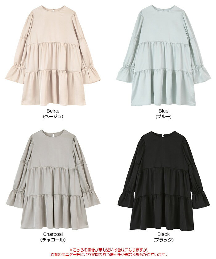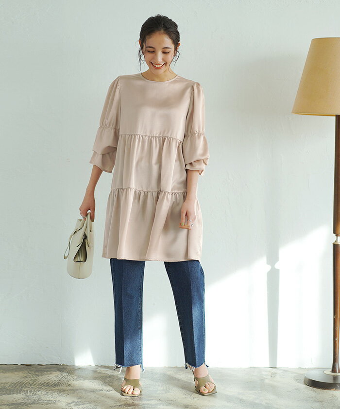 サテンティアードチュニックブラウス/ボリュームのあるティアードデザインが大人可愛い/トップス/レディース/ブラウス/チュニック丈/ロング丈/ラウンドネック/長袖/フレア/オーバーサイズ/光沢/薄手/シンプル【メール便可/60】