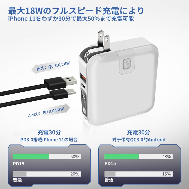 【PD3.0対応USB-CとUSB-Aポート両立!】USB-C ポートのみご利用の場合、最大18WまでPD3.0に対応し、最大18Wのフルスピード充電によりiPhone 11をわずか30分で最大50%まで充電します。