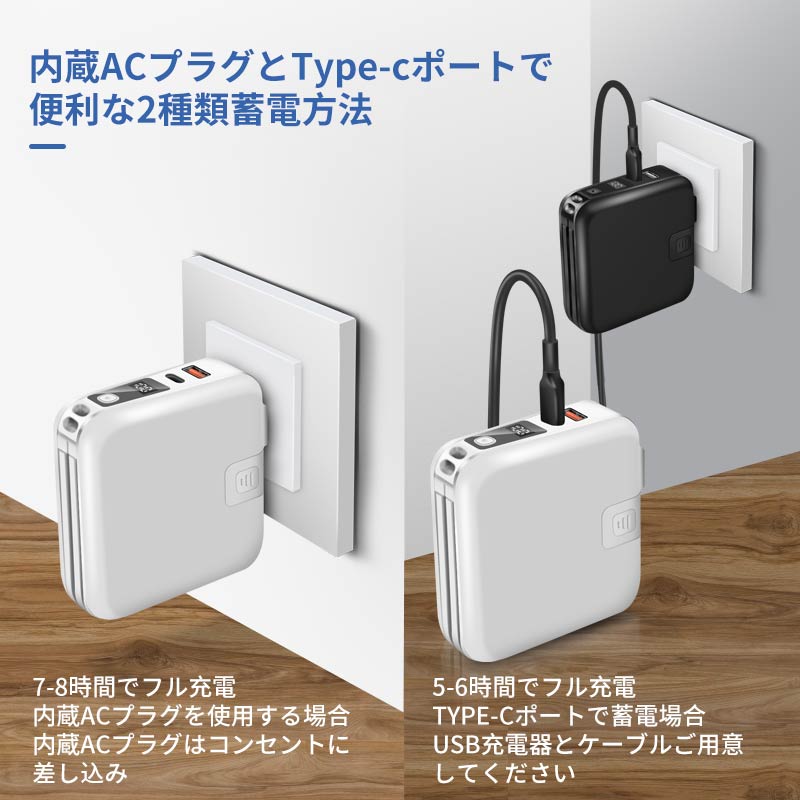 【便利なデザイン!】折畳式ACプラグによるコンパクトな設計、コンセントのある場所であれば即時充電が可能。