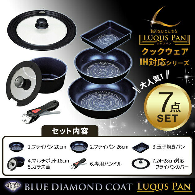 IH対応 ルクスパン ブルーダイヤモンドコート クックウェア7点セットの詳細 品番 HB-2444+HB-2439+H-5072 セット内容 ・フライパン20cm・フライパン26cm・玉子焼きパン・マルチポット18cm・ガラス蓋18cm・専用ハンドル・フライパンカバー サイズ 【マルチポット18cm】(約)φ190×高さ85mm、底の厚さ:2.7mm【フライパン20cm】(約)φ215×高さ50mm【フライパン26cm】(約)φ270×高さ60mm【玉子焼きパン】(約)幅140×奥行190×高さ40mm【ガラス蓋】(約)φ195×高さ40mm【ハンドル】(約)全長170×幅40×高さ40mm【パンカバー】(約)φ30×高さ5.7cm 材質 【フライパン・マルチポット】表面加工/内面:ふっ素樹脂塗膜加工、外面:焼付け塗装【フライパン】本体:アルミニウム合金、はり底:ステンレス鋼【マルチポット】本体:アルミニウム合金、はり底:ステンレス鋼(クロム16%)【ガラス蓋】前面物理強化、金属部:ステンレス鋼、縁部:シリコーンゴム(耐熱温度200度)、つまみ:フェノール樹脂(耐熱温度150度)【ハンドル】樹脂部:フェノール樹脂(耐熱温度150度)、パッキン:シリコーンゴム(耐熱温度250度)、金属部:18-8ステンレス鋼【フライパンカバー】表面加工:ふっ素樹脂加工、本体:アルミニウム合金、ガラス窓:強化ガラス、つまみ:フェノール樹脂 原産国 【フライパン・マルチポット・蓋】中国【ハンドル】韓国 ▼メーカーカタログ▼ >>>画像をクリックすると拡大します<<< メーカー希望小売価格はメーカーカタログに基づいて掲載しています ▼メーカーカタログ▼ >>>画像をクリックすると拡大します<<< メーカー希望小売価格はメーカーカタログに基づいて掲載しています↓クリックでルクスパンシリーズの他の商品のページに移動します フライパン商品一覧はコチラ >>