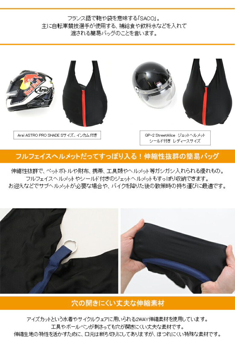 商品名【chari-bura】Travel SACO トラベル サコ【02-L】サイズW31×H50cm 重量:80gカラーブラック×ブルー、ブラック×グリーン、ブラック×イエロー、ブラック×オレンジ素材ポリエステル82%、ポリウレタン18%ポイント原産国:日本 伸縮性のある素材を使用した、ヘルメットの持ち運びに便利なワンショルダーバッグ。