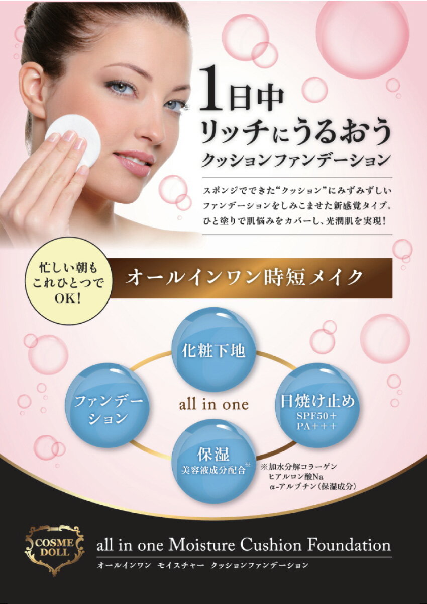 ラッピング包装については下記バナーをご覧下さいクッションファンデーションで時短メイク 商品名コスメドール オールインワン モイスチャー クッションファンデーション メーカー 株式会社LSC 商品説明 クッションファンデーションで時短メイク スポンジでできた”クッション”にみずみずしいファンデーションを染み込ませた、 新感覚ファンデ! これ1つで保湿・化粧下地・日やけ止め・ファンデーションのマルチ機能を持つ 新感覚のオールインワン。