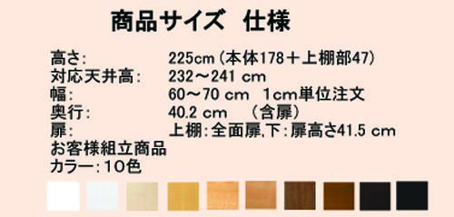 国産壁面本棚_ 国産壁面書棚_ 全面扉スリム壁面収納_ 全面扉スリム壁面本棚_価格 サイズ一覧 色 仕様 多サイズ 耐荷重 棚受 扉 取手 転倒防止 突張棚 天板 突張強化 追加加工 注文 オーダー 奥深下扉付き書庫 (シリーズ天井高208〜292cm、幅15〜90cm) 標準棚板(厚さ1.7cm) 棚板耐荷重:4Kg 奥行40cm 対応天井高さ232〜241cm 幅60〜70cm 下扉高41.5cm 低ホルムアルデヒド 上下扉タイプ 奥深下扉付き書庫 【幅ピッタリ】 幅60〜70cmを1cm単位でご指定頂けます。