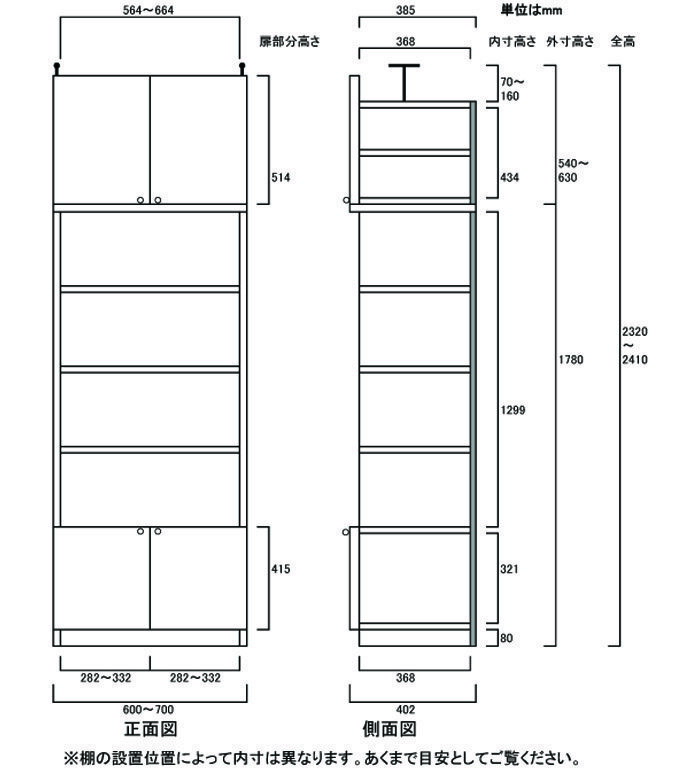 【オプション加工】1.5cm棚板ピッチ、幅木よけ、(配線用)裏板穴加工、タフ棚板穴加工 等 ※幅違い・高さ違い・奥行違いは全サイズ別一覧よりお選び下さい 奥深下扉付き書庫 標準棚板(厚さ1.7cm) 奥行40cm×高さ232〜241cm×幅60〜70cm サイズオーダー キャビネット・コンソール 幅は1cm単位で指定 奥深下扉付き書庫 本体高さ178cm 突張棚高さ47cm 本体扉高さ41.5cm(下扉) 突張棚扉高さ51.4cm ご注意 オプション加工を選択されても価格が自動計算されません。