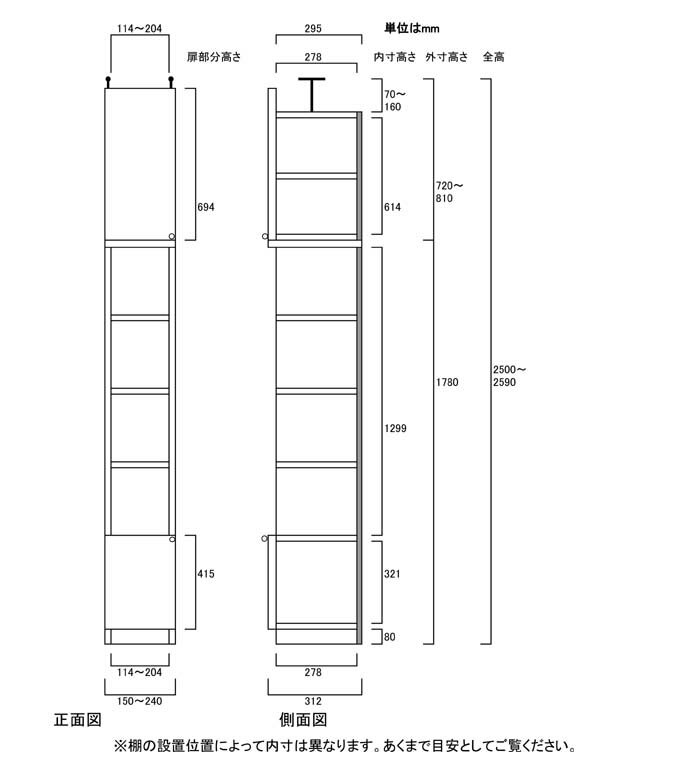 【オプション加工】1.5cm棚板ピッチ、幅木よけ、(配線用)裏板穴加工、タフ棚板穴加工 等 ※幅違い・高さ違い・奥行違いは全サイズ別一覧よりお選び下さい 扉付壁面すきま収納 タフ棚板(厚さ2.5cm) 奥行31cm×高さ250〜259cm×幅15〜24cm サイズオーダー リビング壁面収納 幅は1cm単位で指定 扉付壁面すきま収納 本体高さ178cm 突張棚高さ65cm 本体扉高さ41.5cm(下扉) 突張棚扉高さ69.4cm ご注意 オプション加工を選択されても価格が自動計算されません。