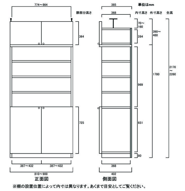 15cmから最大で90cm(棚板厚が標準:17mmタイプは70cm)まで指定できるので、設置場所にピッタリ収まる収納を実現! 全面扉タイプなのでホコリや日焼けを防ぎ、見た目もスッキリ。