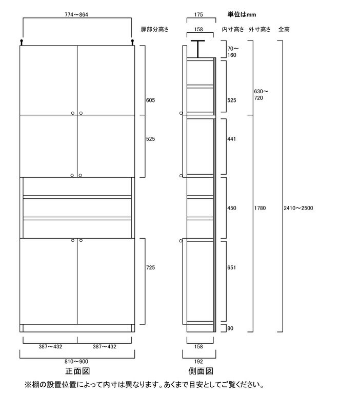 商品仕様 ■棚板タイプ: 厚棚板(厚さ2.5cm)タイプ ■棚板耐荷重: 7Kg ■外寸: 奥行19cm×高さ241〜250cm×幅81〜90cm (幅は1cm単位でオーダーできます) ■対応天井高: 241〜250cm (ラック高さ178cm+突っ張り棚高さ56cm+伸縮突っ張り金具) ■棚板枚数 移動固定棚板:7 ■扉枚数:本体棚 上部扉2枚・下部扉2枚、突っ張り棚 2枚 上下共両開き ■本体棚扉サイズ:上扉52.5cm+下扉72.5cm ■付属品: 突っ張り金具・転倒防止補助バンド・扉取付用ヒンジ・取っ手用金具(標準つまみ)・ビス ■外寸(幅): 81cm 82cm 83cm 84cm 84cm 85cm 86cm 87cm 89cm 90cm 共通仕様 ■材質: プリント化粧繊維板 ■塗装: ウレタン樹脂塗装 ■素材: ホルムアルデヒドの発生を最小限に抑えた基材・芯材・プリント紙・接着剤(F☆