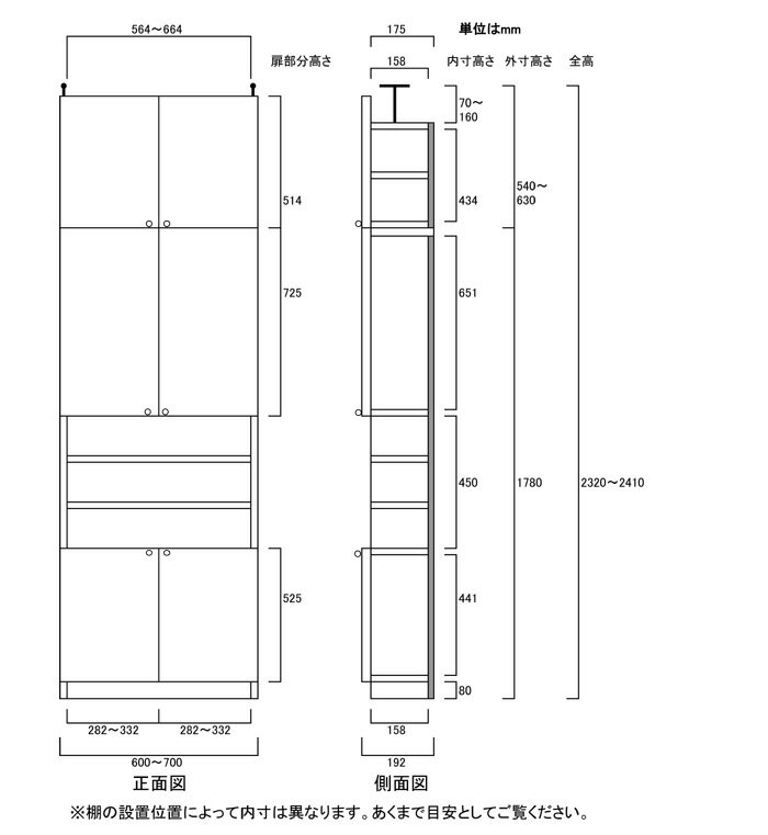 商品仕様 ■棚板タイプ: 厚棚板(厚さ2.5cm)タイプ ■棚板耐荷重: 7Kg ■外寸: 奥行19cm×高さ232〜241cm×幅60〜70cm (幅は1cm単位でオーダーできます) ■対応天井高: 232〜241cm (ラック高さ178cm+突っ張り棚高さ47cm+伸縮突っ張り金具) ■棚板枚数 移動固定棚板:7 ■扉枚数:本体棚 上部扉2枚・下部扉2枚、突っ張り棚 2枚 両開き ■本体棚扉サイズ:上扉72.5cm+下扉52.5cm ■付属品: 突っ張り金具・転倒防止補助バンド・扉取付用ヒンジ・取っ手用金具(標準つまみ)・ビス ■外寸(幅): 60cm 61cm 62cm 63cm 64cm 65cm 67cm 68cm 69cm 70cm 共通仕様 ■材質: プリント化粧繊維板 ■塗装: ウレタン樹脂塗装 ■素材: ホルムアルデヒドの発生を最小限に抑えた基材・芯材・プリント紙・接着剤(F☆