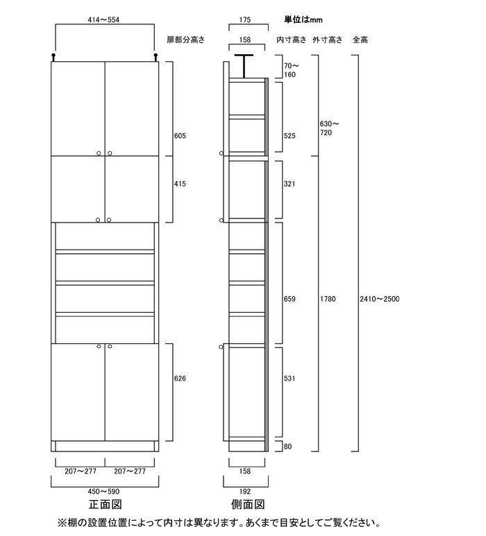 商品仕様 ■棚板タイプ: 厚棚板(厚さ2.5cm)タイプ ■棚板耐荷重: 7Kg ■外寸: 奥行19cm×高さ241〜250cm×幅45〜59cm (幅は1cm単位でオーダーできます) ■対応天井高: 241〜250cm (ラック高さ178cm+突っ張り棚高さ56cm+伸縮突っ張り金具) ■棚板枚数 移動固定棚板:7 ■扉枚数:本体棚 上部扉2枚・下部扉2枚、突っ張り棚 2枚 両開き ■本体棚扉サイズ:上扉41.5cm+下扉62.6cm ■付属品: 突っ張り金具・転倒防止補助バンド・扉取付用ヒンジ・取っ手用金具(標準つまみ)・ビス ■外寸(幅): 45cm 46cm 47cm 48cm 49cm 50cm 51cm 52cm 53cm 54cm 55cm 56cm 57cm 58cm 59cm 共通仕様 ■材質: プリント化粧繊維板 ■塗装: ウレタン樹脂塗装 ■素材: ホルムアルデヒドの発生を最小限に抑えた基材・芯材・プリント紙・接着剤(F☆